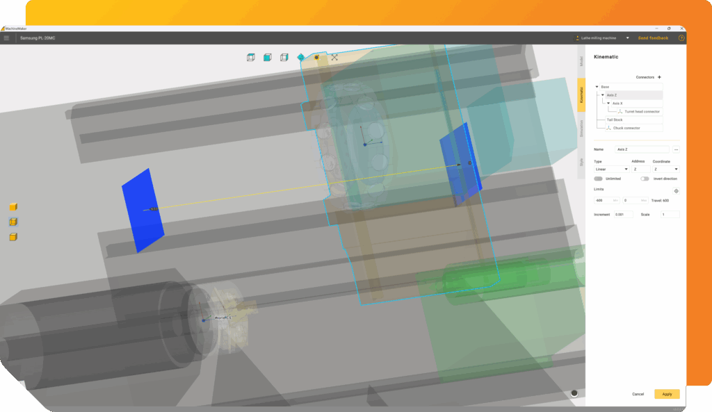 Create virtual CNC machines and robotic cells using an intuitive drag-and-drop interface, complete with kinematics, collision detection, and reusable components. Fully integrated into your CAD/CAM workflow.