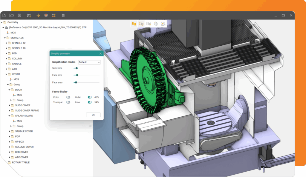 Importeer en vereenvoudig 3D-modellen van CNC machines of industriële robotos om overbodige elementen te verwijderen, het geheugengebruik te minimaliseren en soepele prestaties te garanderen.